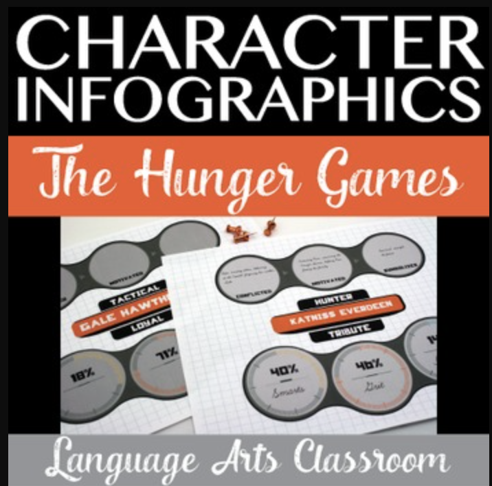 ⇿ Each character – Katniss, Gale, Peeta, Prim, Rue, and Haymitch- has his or her own infographic. Students will analyze the characters through their conflicts, motivations, and symbols. Then they will characterize their character through percentages. (Example: Katniss is 40% Smarts, 47% Grit, and 14% Instinct). Student creativity will flourish with these infographics.