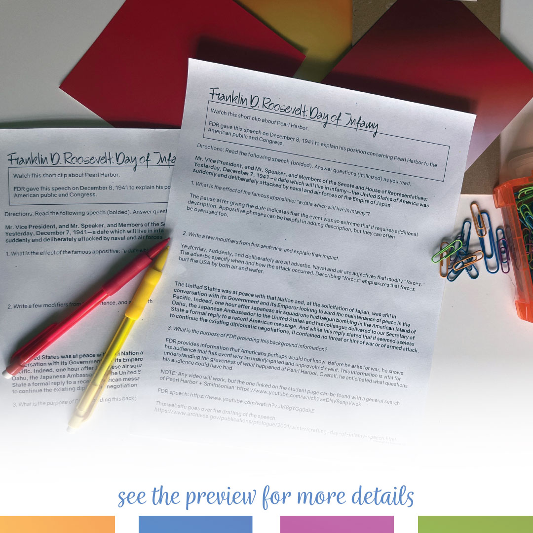 Teach FDR’s famous speech “Day of Infamy” with this speech analysis activity. This speech activity includes 10 analytical questions in both PDF and an editable Word document.